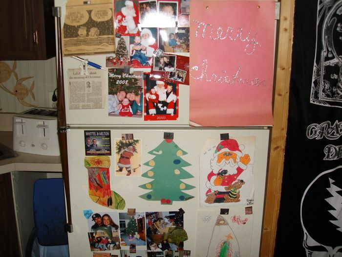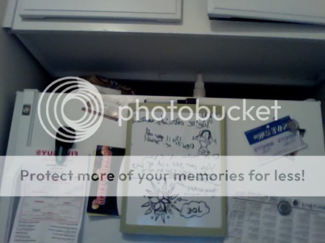 I can’t take a pic, but mine is pretty pathetic. The freezer is covered by a giant, 3-month dry erase calander because I cannot remember jack shit that’s not written down. The rest is occupied by random school-related memos for Makenzie and a picture of my niece when she was 2 months old.